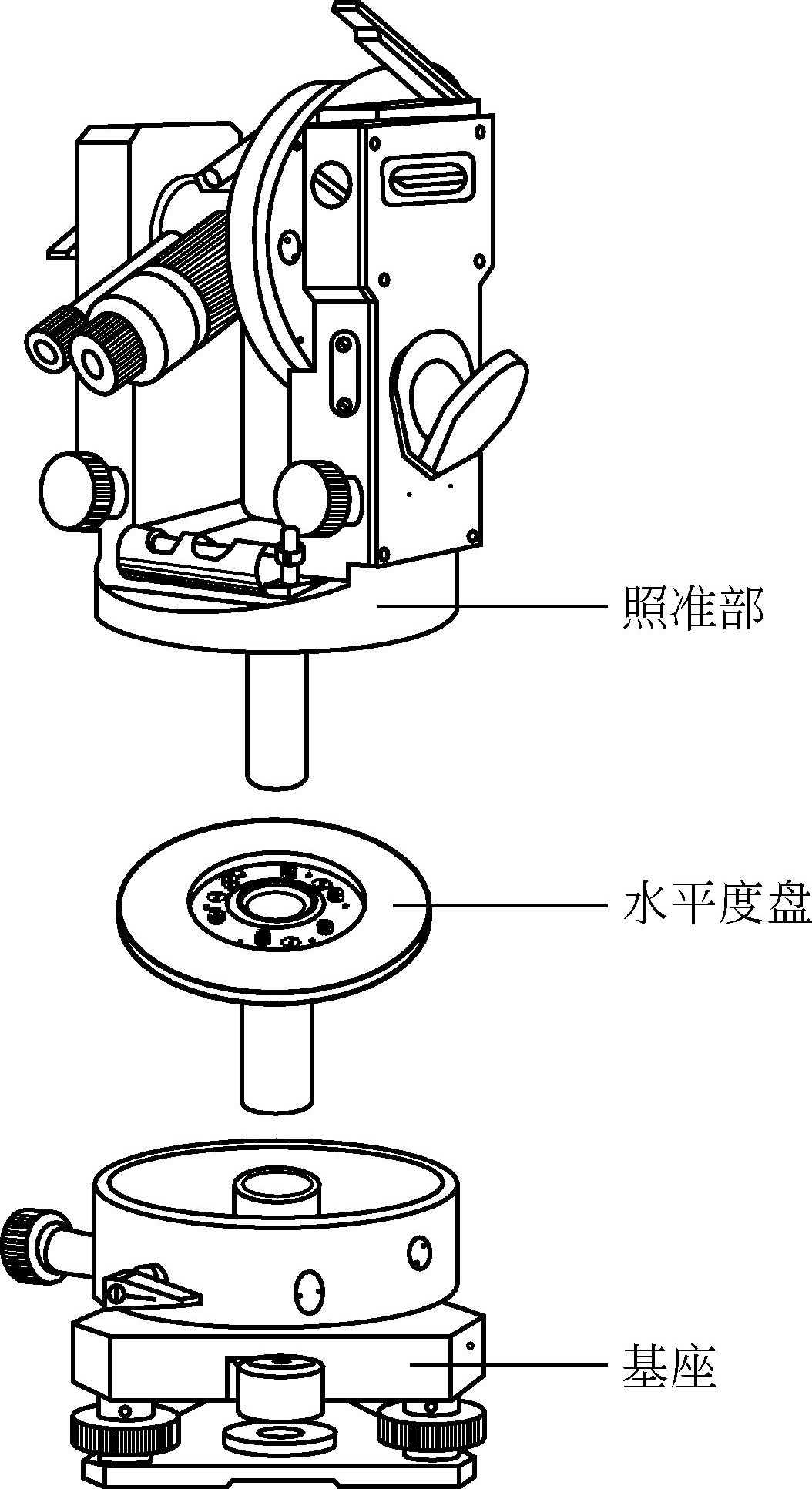 (1)照准部 照准部是光学经纬仪的重要组成部分,主要指水平度盘之上,能绕其旋转轴旋转的全部部件的总称,它主要由望远镜、照准部管水准器、竖直度盘(或简称竖盘)、竖盘指标管水准器、读数显微镜、横轴、竖轴、U形支架和光学对中器等各部分组成。照准部可绕竖轴在水平面内转动,由水平制动螺旋和水平微动螺旋控制。
