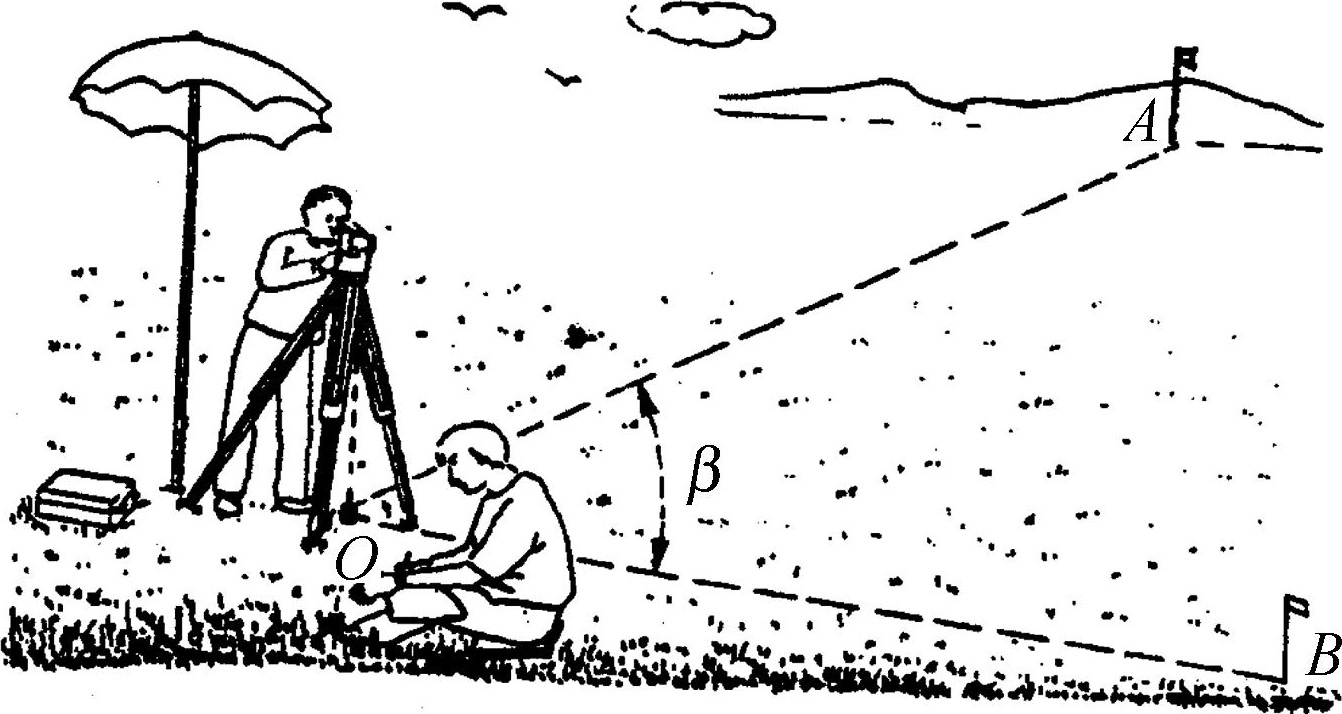 如图3-14所示,测量 OA 、 OB 两方向之间的水平角 β ,先将经纬仪安置在测站点 O 上,并在 A 、 B 两点上分别设置照准标志(竖立花杆或测钎),因为水平度盘是顺时针注记,故选取起始方向(零方向)时,应正确配置起始读数。其观测方法和步骤如下。