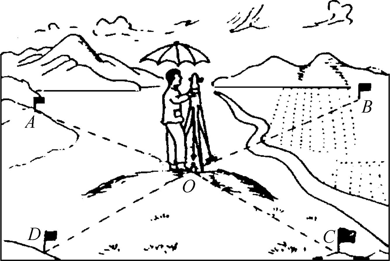 (1)如图3-15所示,在测站 O 上安置经纬仪,选一成像清晰的目标 A 作为零方向,盘左照准 A 点标志,按置数方法使水平度盘读数略大于零,读数并记入表3-2手簿第4栏中。