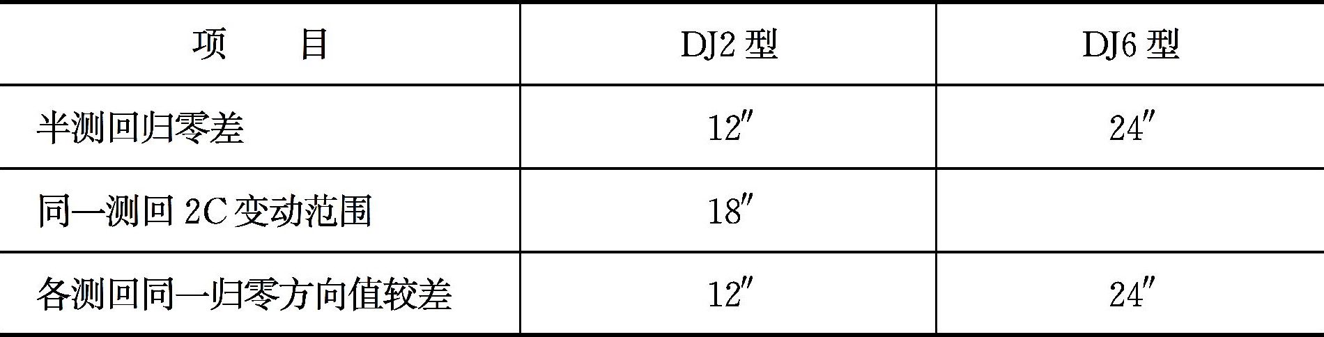 (3)归零方向值的计算 表3-2第7栏中各值的计算,是用第6栏中各方向值减去零方向括号内之值。例如:第一测回方向 C 的归零方向值为105°45'42″-0°01'15″=105°44'27″。一测站按规定测回数测完后,应比较同一方向各测回归零后方向值,检查其较差是否超限,如表3-2中 D 方向两个测回较差为12″。如不超限,则取各测回同一方向值的中数记入表3-2中第8栏。第8栏相邻两方向值之差即为该两方向线之间的水平角,记入表3-2中第9栏。一测回观测完成后,应及时进行计算,并对照检查各项限差,如有超限,应进行重测。水平角观测各项限差要求如表3-3所示。