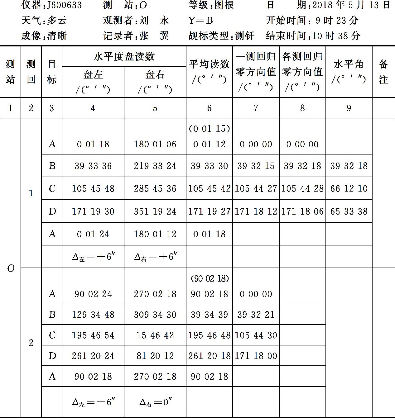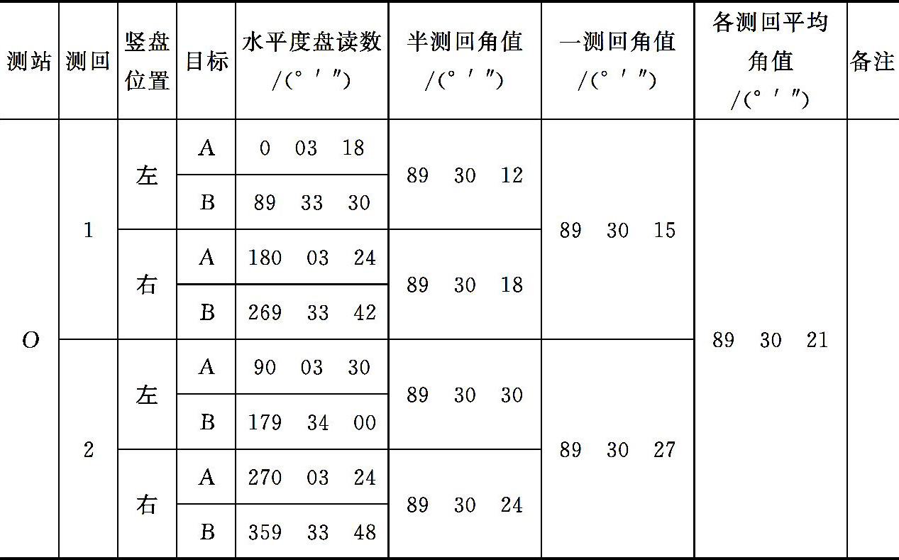 以上操作过程称为一测回,表3-2为全圆方向观测法两个测回的记录计算格式。