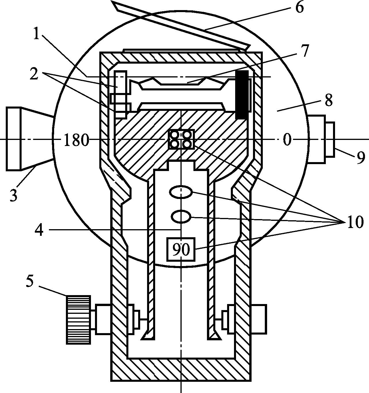 竖直度盘的影像通过棱镜和透镜所组成的光具组10,成像于读数显微镜的读数窗内。光具组10的光轴和读数窗中测微尺的零分划线构成竖盘读数指标线,读数指标线相对于转动的度盘是固定不动的。因此,当转动望远镜照准高低不同的目标时,用指标线便可在转动的度盘上读取不同的读数。光具组10又和竖盘指标水准管固定在一个微动支架上,并使竖盘指标水准管轴1和光具组光轴4相垂直,当转动竖盘指标水准管时,读数指标线作微小移动;当竖盘指标水准管气泡居中时,读数指标线处于正确位置。因此,在进行竖直角观测时,每次读取竖盘读数之前,都必须先使竖盘指标水准管气泡居中。