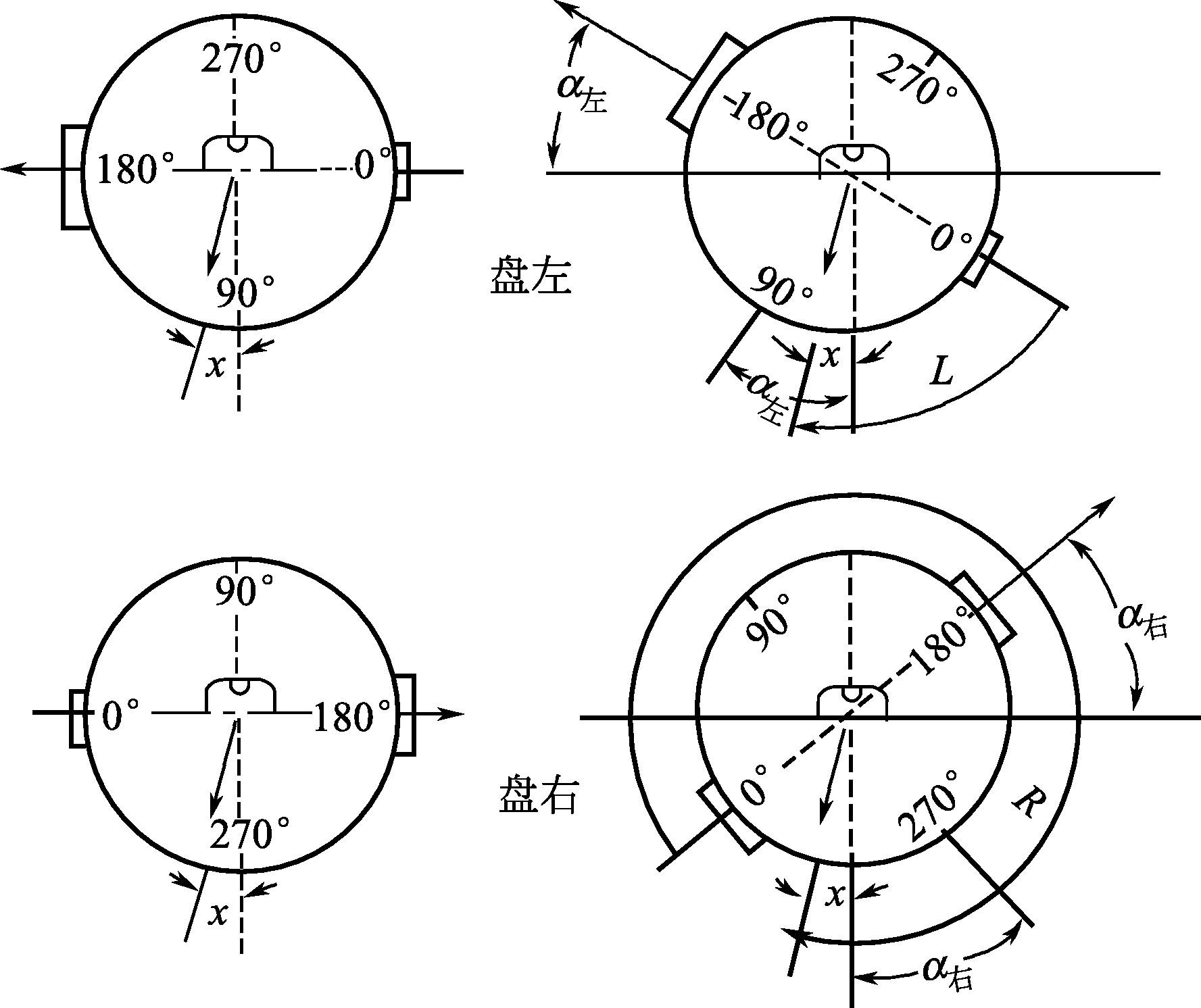(3)指标差 x 的值有正有负,当指标线沿度盘注记方向偏移时,造成读数偏大,则 x 为正,反之 x 为负。