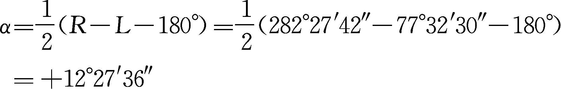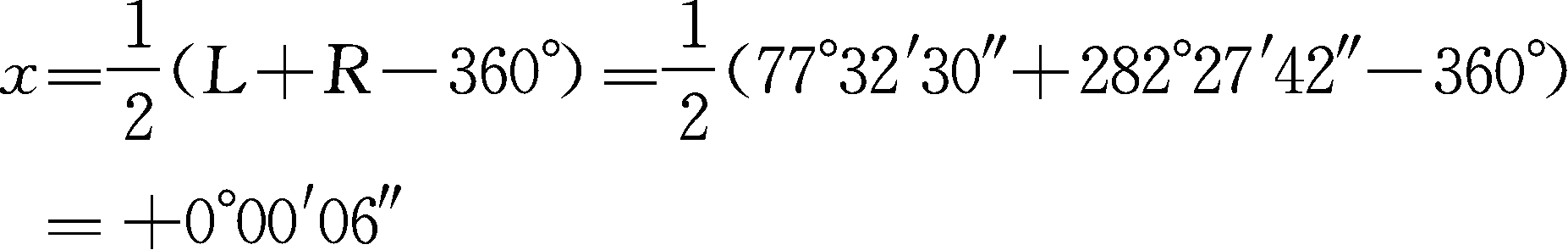 【例3-14】 观测一个高处目标,盘左时的竖盘读数为77°32'30″,盘右时的竖盘读数为282°27'42″,根据式(3-11)可得