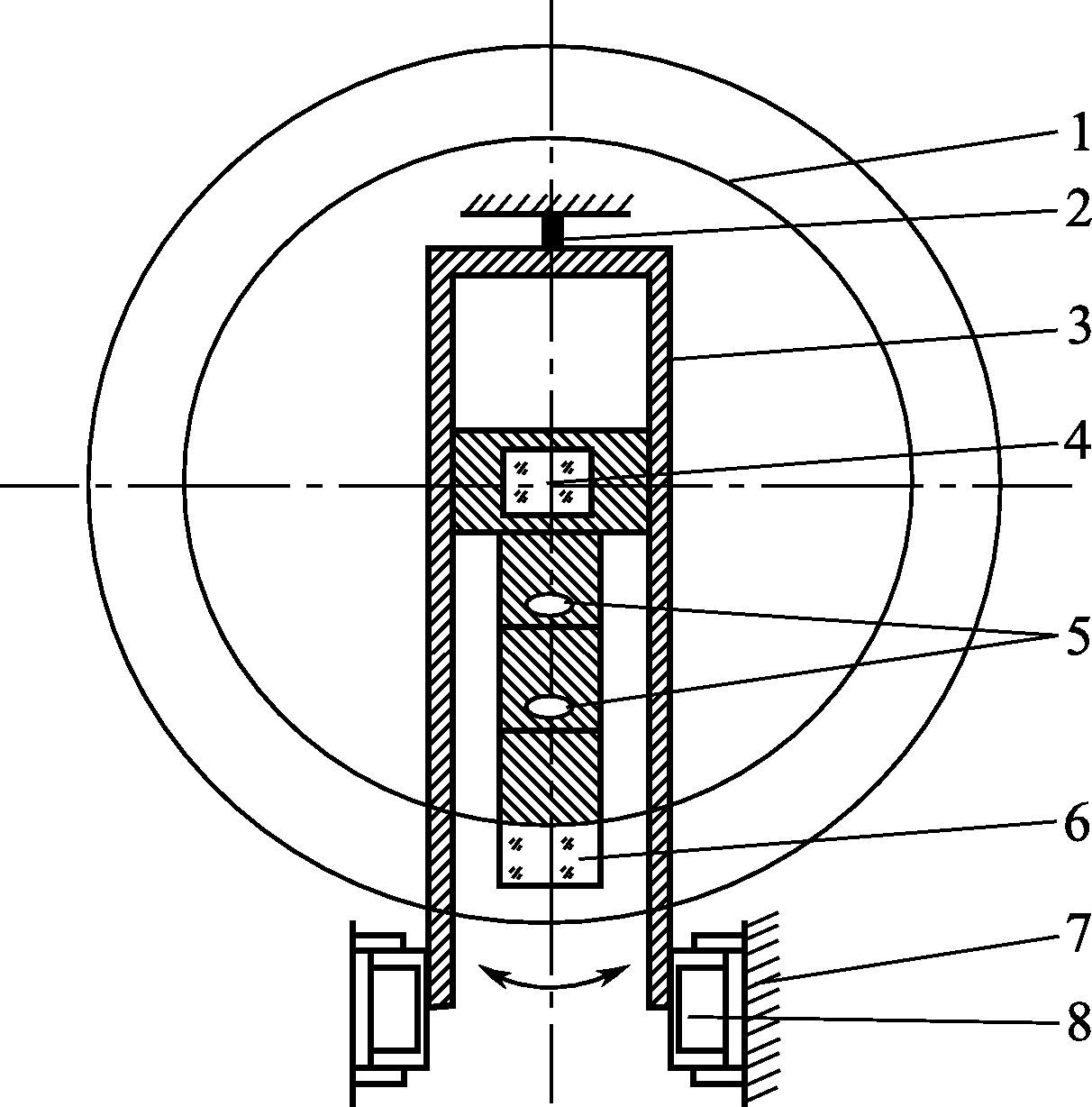 经纬仪竖盘指标自动归零装置常见结构有悬吊透镜、液体盒两种。如图3-20所示为悬吊透镜补偿器结构示意图。读数棱镜系统悬挂在一个弹性摆上,依靠摆的重力和空气阻尼盒的共同作用,能使弹性摆迅速处于静止位置。此种补偿器结构简单,未增加任何光学零件,只是将原有的成像透镜进行悬吊,当仪器在±2'范围内稍倾斜时,可达到自动补偿的目的。