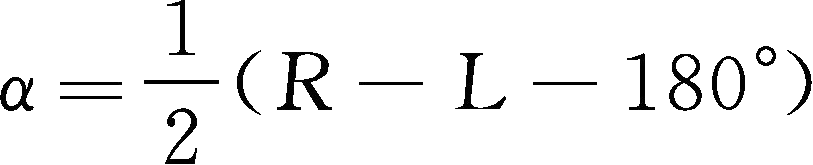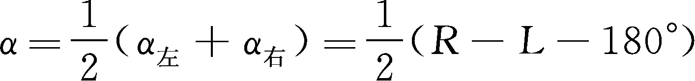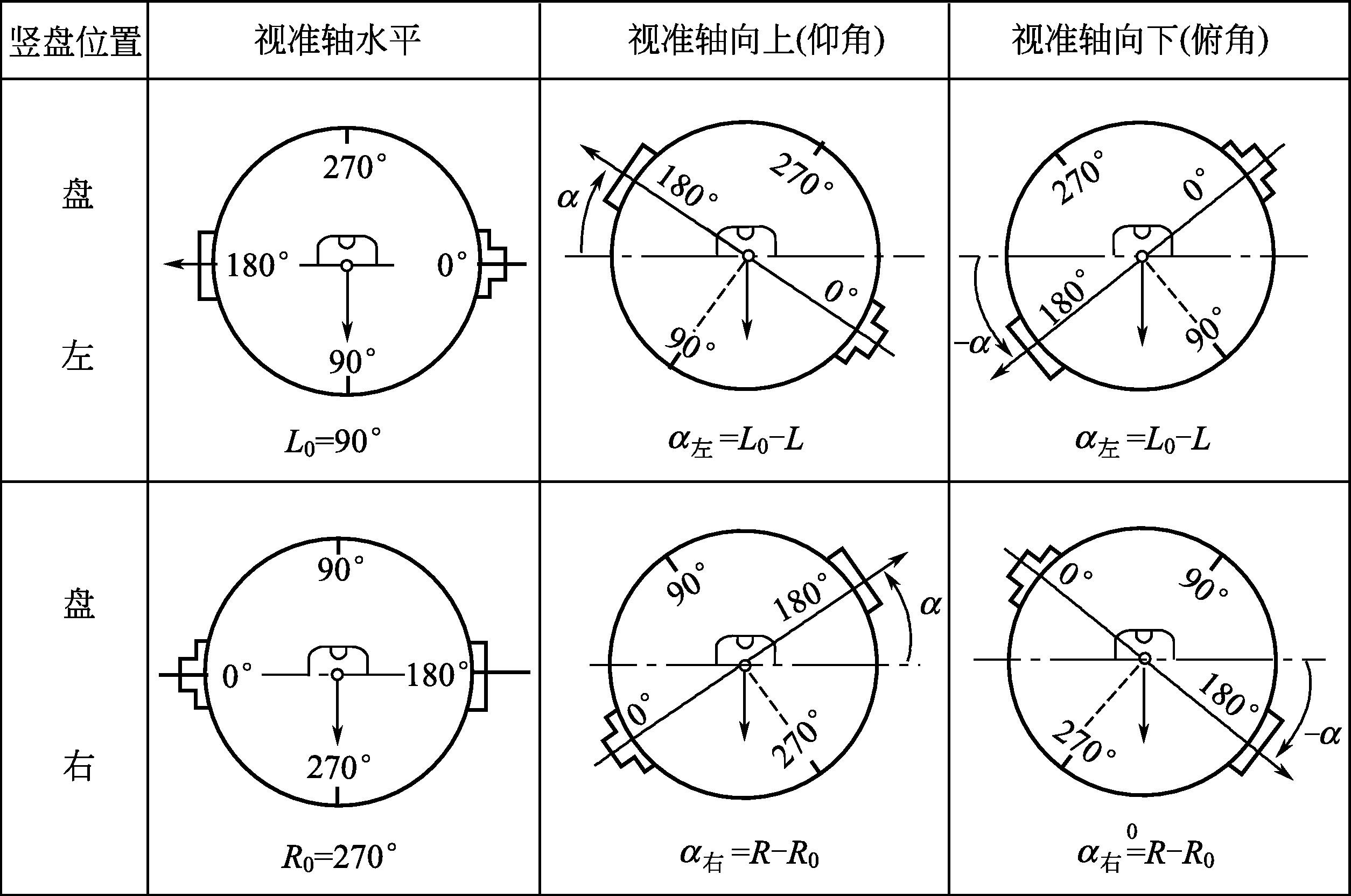 如图3-17(b)所示,设望远镜视线水平时,其竖盘读数盘左为 L 0 ,盘右为 R 0 ;望远镜照准目标时盘左、盘右竖盘读数分别为 L 和 R 。