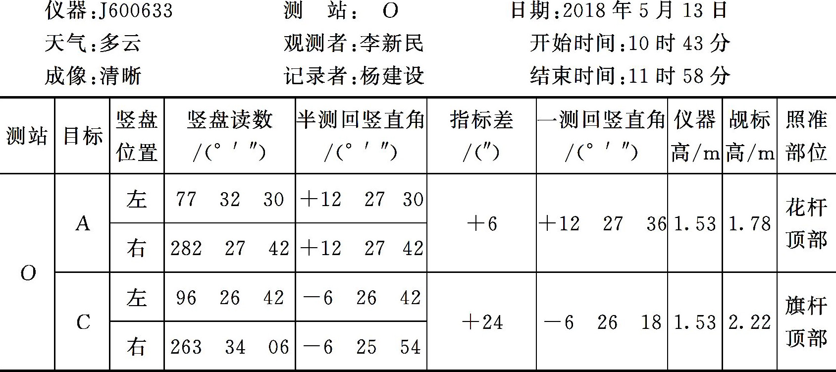 在一个测站的观测过程中,其指标差值应该是一个固定值,但由于受外界条件和观测误差的影响,使得各方向的指标差值往往不相等,为了保证观测精度,对DJ6经纬仪需要规定其指标差变化的限差,一般规定如下:同一测回中,各方向指标差互差不应超过24″。同一方向各测回竖直角互差不应超过24″。若指标差互差和竖直角互差符合要求,则取各测回同一方向竖直角的平均值作为各方向竖直角的最后结果。