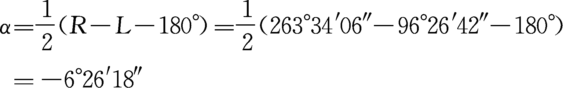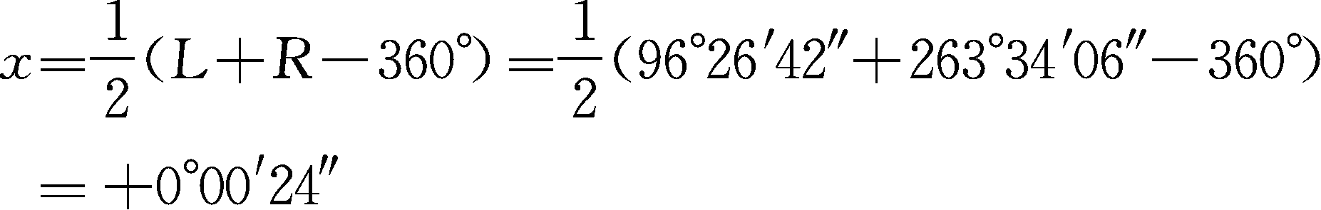 又如观测一个低处目标,盘左时的竖盘读数为96°26'42″,盘右时的竖盘读数为263°34'06″,根据式(3-11)可得