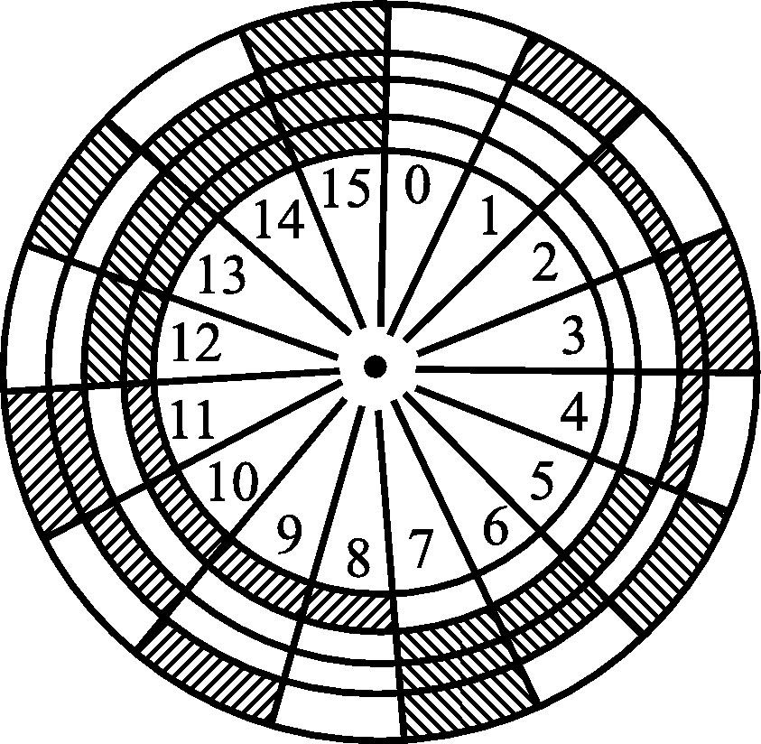 如图3-29所示,光电编码度盘是在光学度盘刻度圈圆周设置等间隔的透光与不透光区域,称白区与黑区,由它们组成的分度圈称为码道,一个编码度盘有很多同心的码道,码道越多,编码度盘的角度分辨率越高。电子计数采用二进制编码方法,码盘上的白区与黑区分别表示二进制代码“0”和“1”。为了读取编码,需在编码度盘的每一个码道的一侧设置发光二极管,另一侧设置光敏二极管,它们严格地沿度盘半径方向成一直线。发光二极管发出的光通过码盘产生透光或不透光信号,由光敏二极管转换成电信号,经处理后,以十进制或60进制自动显示。