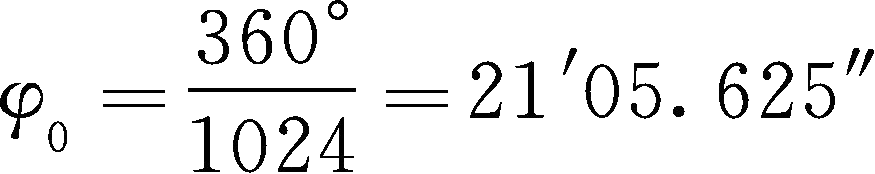 如图3-32所示,在度盘上刻有1024个分划,两条分划条纹的角距为 φ 0 ,则