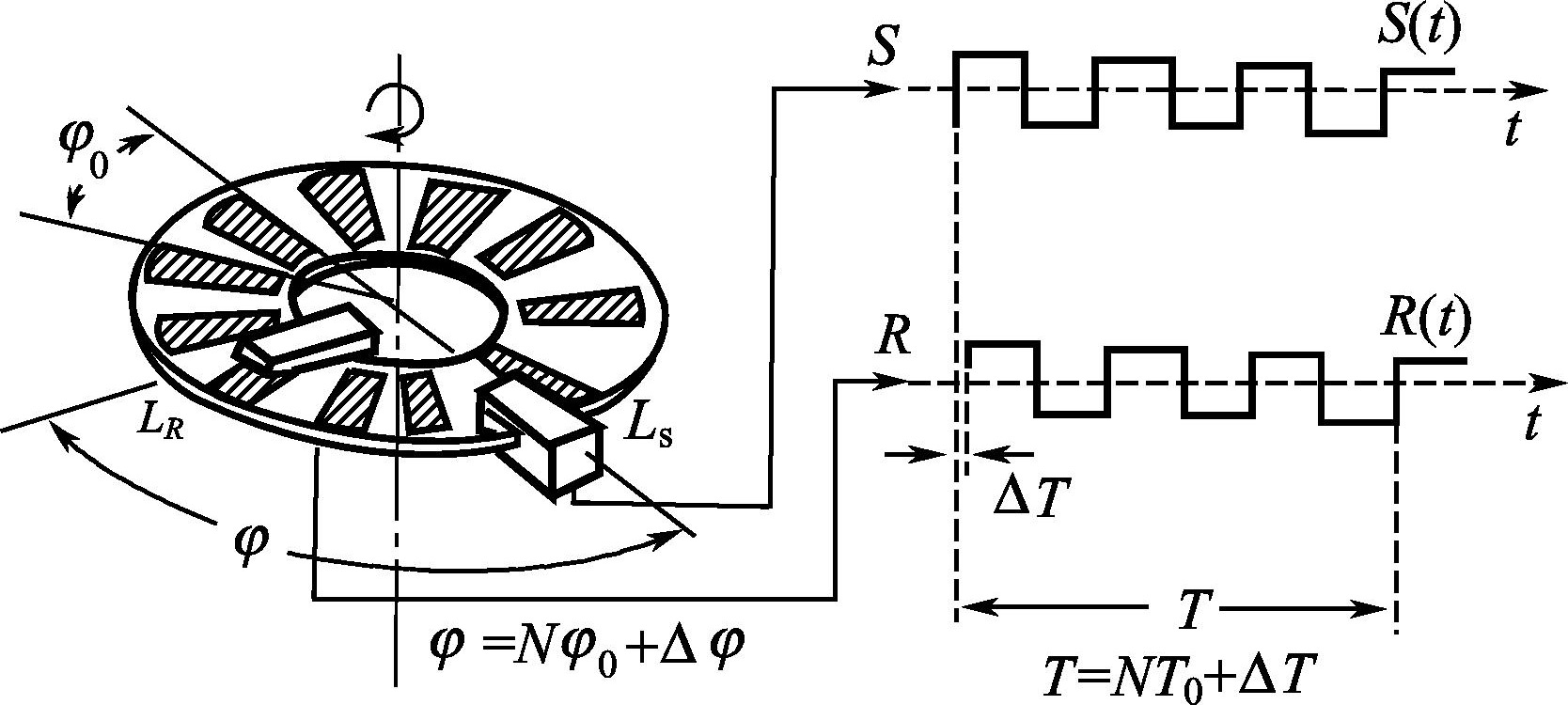 如图3-30所示,在光学玻璃圆盘上均匀地刻有许多等间隔的狭缝,称为光栅。光栅的线条处为不透光区,缝隙处为透光区。在光栅盘上下对应位置设置发光二极管和光敏二极管,则可使计数器累计求得所移动的栅距数,从而得到转动的角度值。