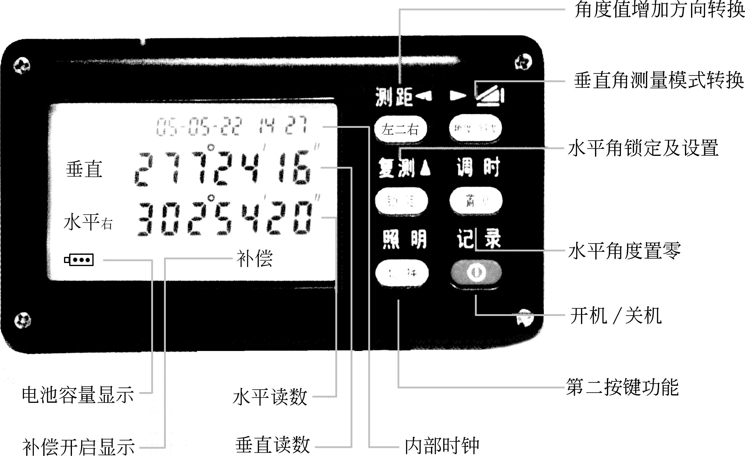 DT200系列电子经纬仪(图3-33)采用光栅增量式数字角度测量系统,使用微型计算机技术进行测量、计算、显示、存储等多项功能,可同时显示水平、垂直角测量结果,可以进行角度、坡度等多种模式的测量。最小读数为1″/5″/10″/20″四种,以测角精度分为2″、5″两种型号。采用超大屏幕,全中文操作,读取数据更为方便,自动垂直补偿;有复测功能,在保证测量精度的同时,减少数据的记录量;省电设计,工作时间长,四节AA碱性电池能让仪器连续工作80个小时;支持断电数据保护,操作更安全。图3-34为电子经纬仪显示面板。