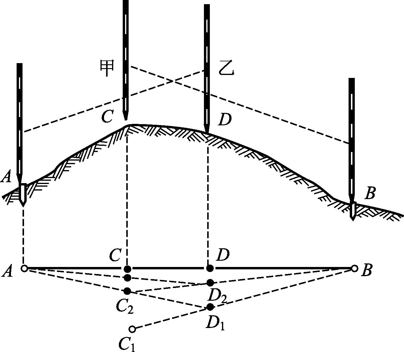 过高地定线适用于 A 、 B 两点在高地两侧,互不通视情况下的量距。如图4-6所示,欲在 A 、 B 两点间标定直线,可采用逐渐趋近法。先在 A 、 B 两点上竖立标杆,甲、乙两人各持标杆分别选择 C 1 和 D 1 处站立,要求 B 、 D 1 、 C 1 位于同一直线上,且甲能看到 B 点,乙能看到 A 点。可先由甲站在 C 1 处指挥乙移动至 BC 1 直线上的 D 1 处。然后,由站在 D 1 处的乙指挥甲移动至 AD 1 直线上的 C 2 点,要求甲站在 C 2 处能看到 B 点,接着再由站在 C 2 处的甲指挥乙移至能看到 A 点的 D 2 处,这样逐渐趋近,直到 C 、 D 、 B 在一直线上,同时 A 、 C 、 D 也在一直线上,这时说明 A 、 C 、 D 、 B 均在同一直线上。