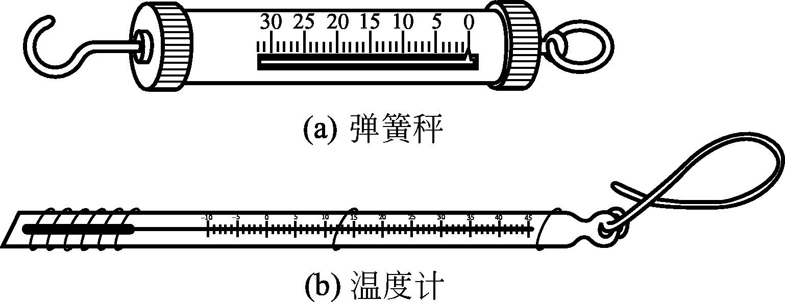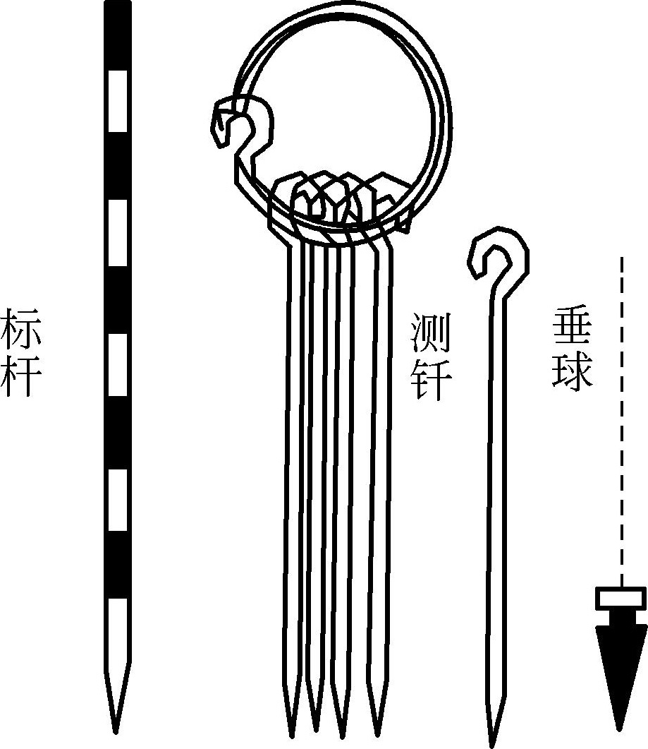 如图4-3所示,钢尺量距的辅助工具有测钎、标杆、垂球等。测钎亦称测针,用直径5mm左右的粗钢丝制成,长30~40cm,上端弯成环形,下端磨尖,一般以11根为一组,穿在铁环中,用来标定尺的端点位置和计算整尺段数;标杆又称花杆,直径3~4cm,长2~3m,杆身涂以20cm间隔的红、白漆,下端装有锥形铁尖,主要用于标定直线方向;垂球用于在不平坦地面丈量时将钢尺的端点垂直投影到地面。当进行精密量距时,还需配备弹簧秤和温度计,弹簧秤用于对钢尺施加规定的拉力,温度计用于测定钢尺量距时的温度,以便对钢尺丈量的距离施加温度改正,如图4-4所示。