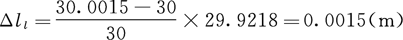【例4-2】 某钢尺的名义长度为50m,当温度为20℃时,其真实长度为49.994m。求该钢尺的尺长方程式。