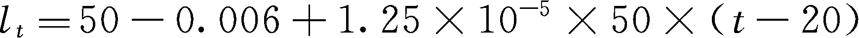 解:根据题意 l 0 =50m, t 0 =20℃,Δ l =49.994-50=-0.006(m),则该钢尺的尺长方程式为