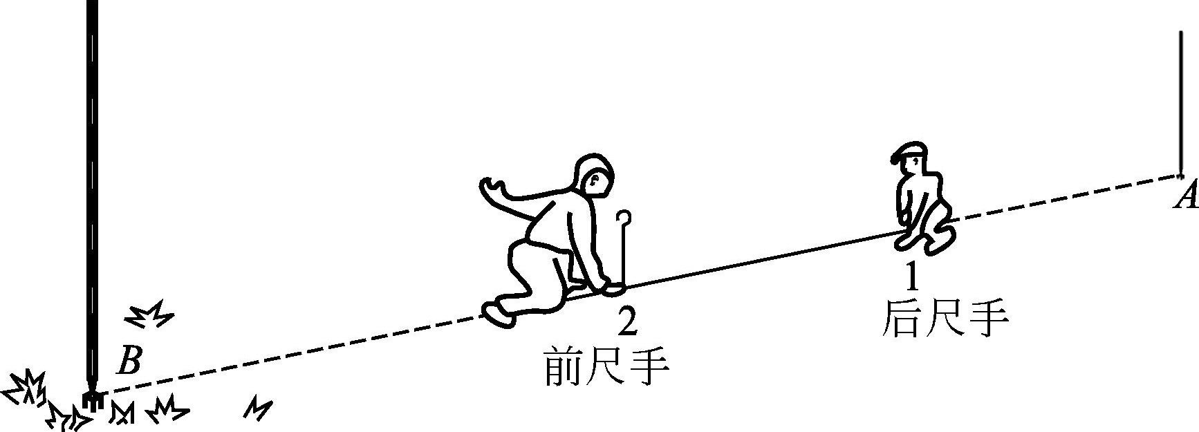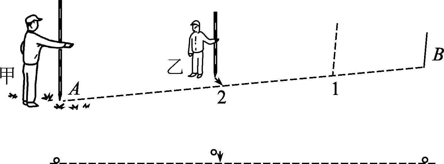 目测定线适用于钢尺量距的一般方法。如图4-5所示,设 A 和 B 为地面上相互通视、待测距离的两点。现要在直线 AB 上定出“1”“2”等分段点。先在 A 、 B 两点上竖立花杆,甲站在 A 杆后约1m处,指挥乙左右移动花杆,直到甲在 A 点沿标杆的同一侧看见 A 、“1”、 B 三花杆在同一直线上。用同样方法可定出“2”点。直线定线一般应由远到近,即先定“1”点,再定“2”点。为了不挡住甲的视线,乙应持花杆站立在直线方向的左侧或右侧。