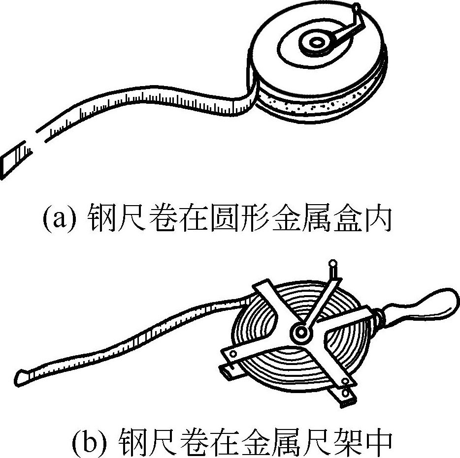 钢尺量距的首要工具是钢尺。又称钢卷尺,尺的宽度约10~15mm,厚度约0.3~0.4mm,长度有20m、30m、50m、100m等几种。最小刻画到毫米,有的钢尺仅在零至一分米之间刻画到毫米,其他部分刻画到厘米。在分米和米的刻画处,注有数字注记。钢尺卷在圆形金属盒中或金属尺架内,便于携带使用,如图4-1所示。