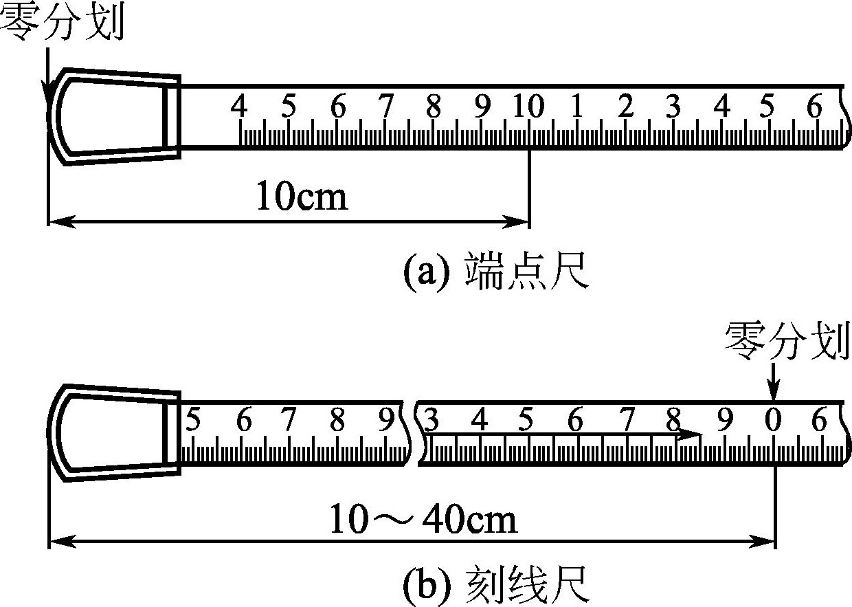 钢卷尺由于尺的零点位置不同,有刻线尺和端点尺之分,如图4-2所示。刻线尺是在尺上刻出零点的位置;端点尺是以尺的端部、金属环的最外端为零点。