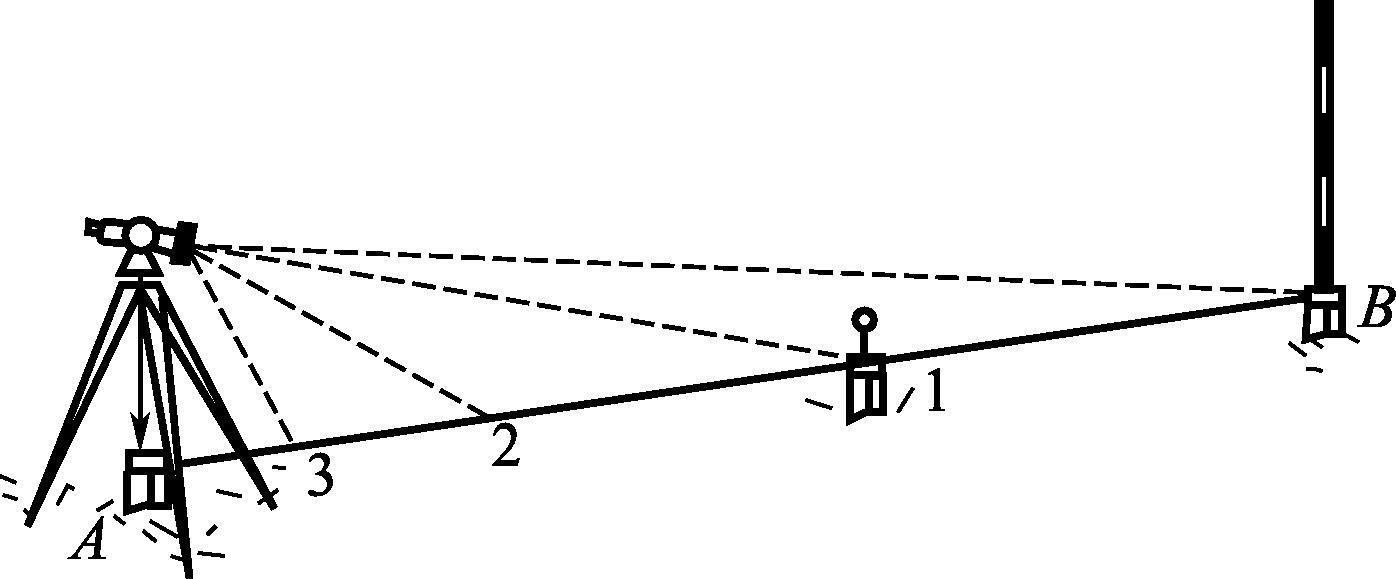 当直线定线精度要求较高时,可用经纬仪定线。如图4-7所示,欲在 AB 直线上精确定出“1”“2”“3”点的位置,可将经纬仪安置于 A 点,用望远镜照准 B 点,固定照准部制动螺旋,沿 AB 方向用钢尺进行概量,按稍短于一尺段长的位置,由经纬仪指挥打下木桩,桩顶高出地面约10~20cm,然后将望远镜向下俯视,将十字丝交点投测到木桩上,并钉小钉以确定出“1”点的位置(也可用桩顶包铁皮划十字线)。同法标定出“2”、“3”点的位置,小钉(或十字线中心)即为丈量时的标志。