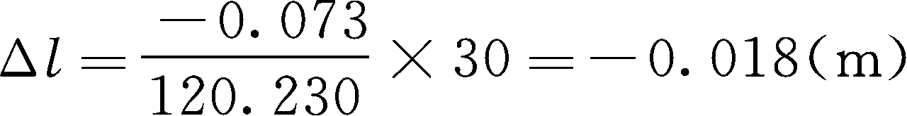 【例4-4】 设基线长为120.230m,用名义长度为30m的作业钢尺丈量基线的结果是120.303m,丈量时的温度为14℃,求作业钢尺的尺长方程式。