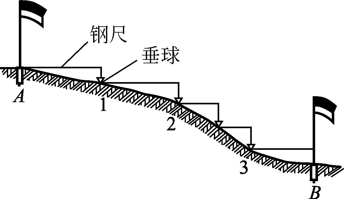 若地面倾斜较大,将钢尺整尺拉平有困难时,可将一尺段分成几段来平量。