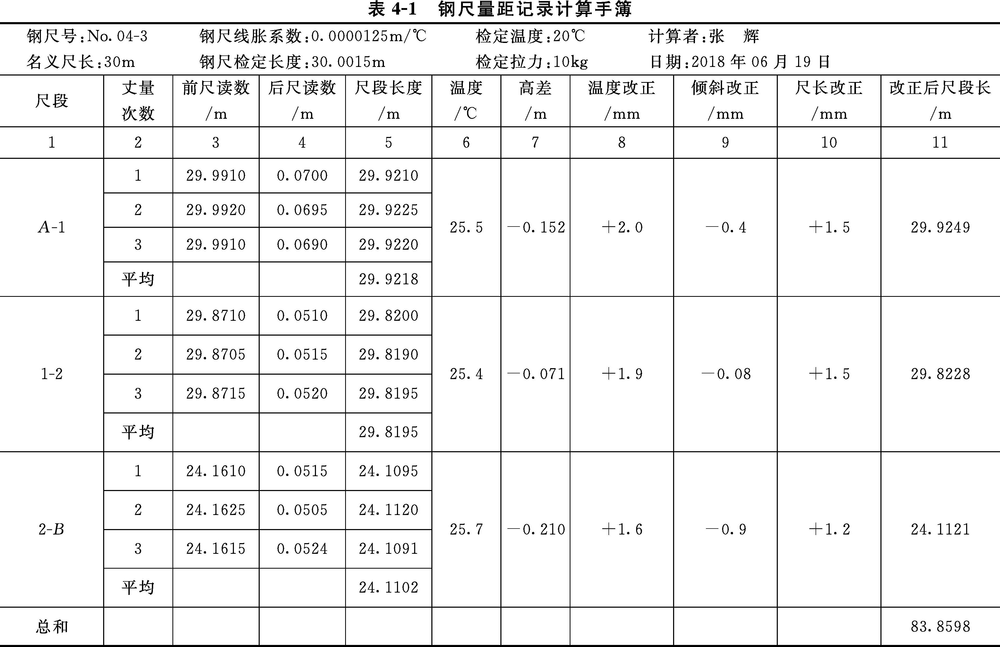 其余各段改正计算与 A -1段相同,然后将各段相加为83.8598m。如表4-1中,设返测的总长度为83.8524m,可以求出相对误差,用来检查量距的精度。