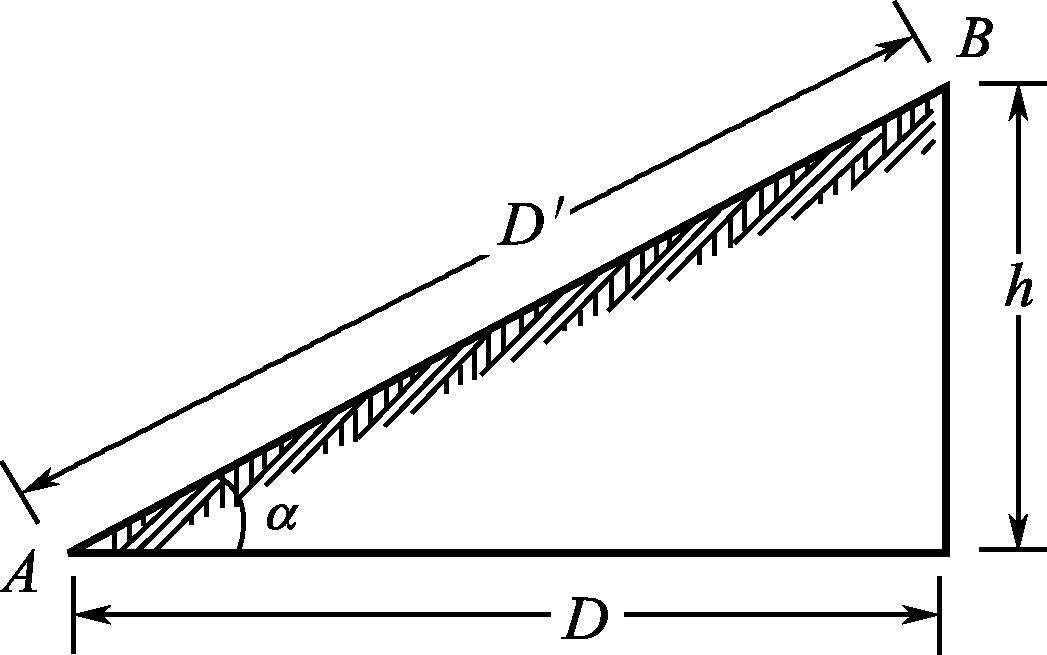 (2)斜量法 当倾斜地面的坡度比较均匀时,如图4-10所示,可沿斜面直接丈量出 AB 的倾斜距离 D ',测出地面倾斜角 α 或 AB 两点间的高差 h ,按下式计算 AB 的水平距离 D 。
