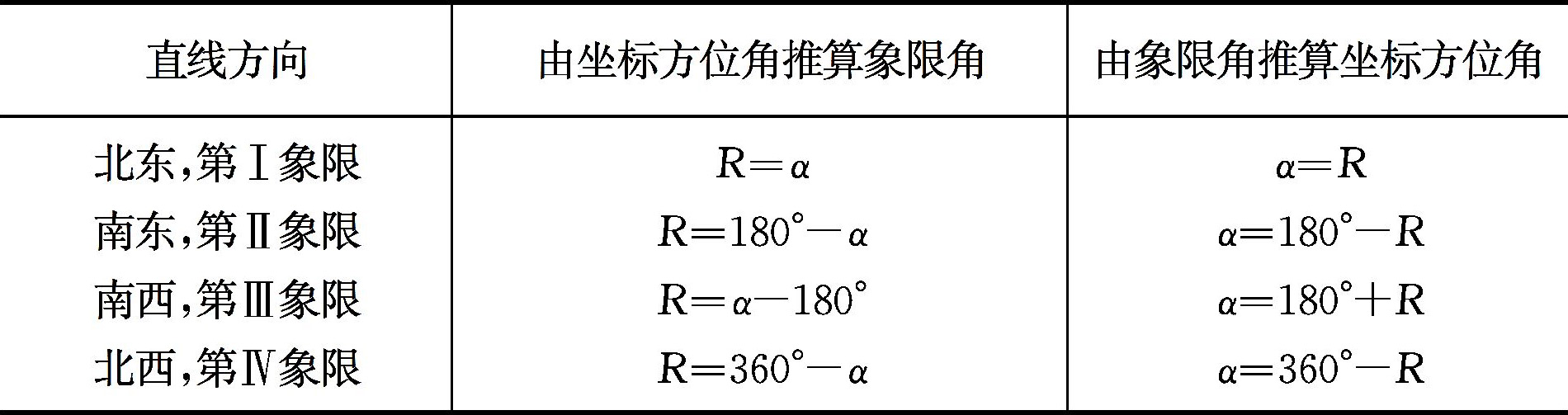 表4-3 坐标方位角与象限角的换算关系表