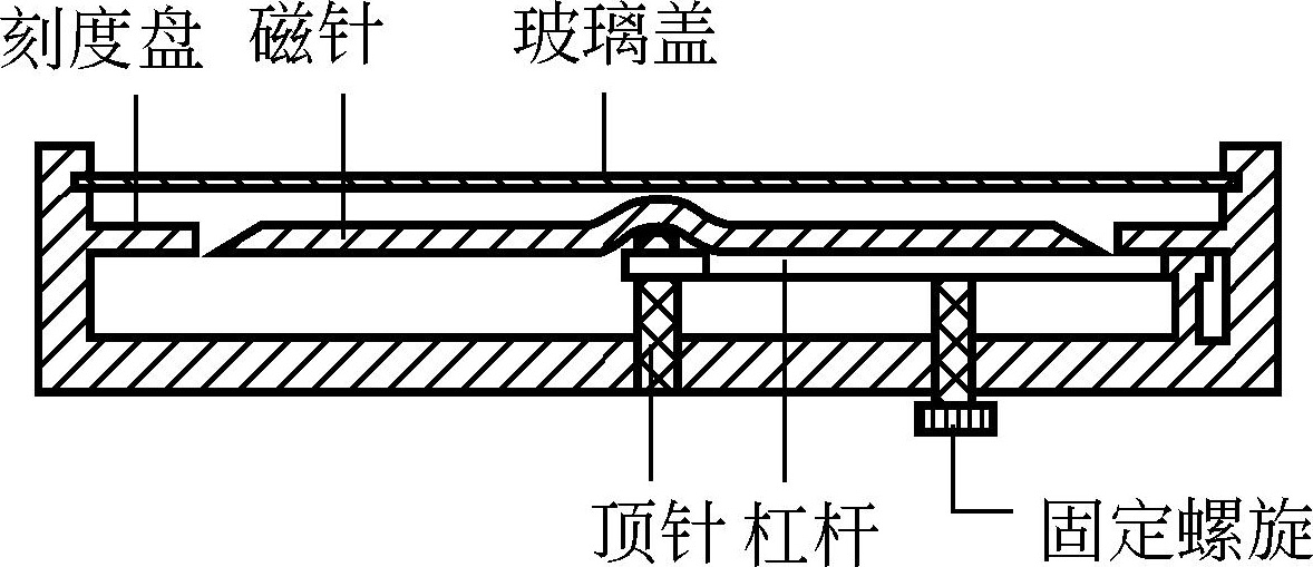 (1)磁针 磁针用人造磁铁制成,磁针在度盘中心的顶针尖上可自由转动。为了减轻顶针尖的磨损,在不用时,可用位于底部的固定螺旋升高杠杆,将磁针固定在玻璃盖上。