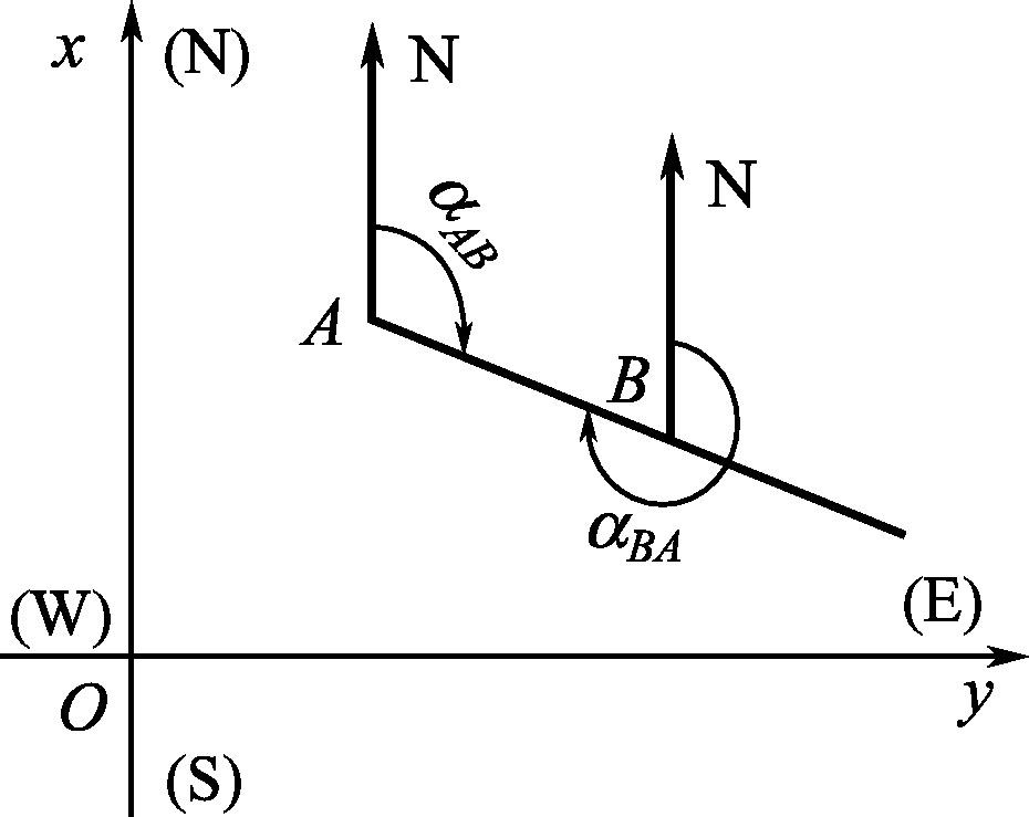 测量工作中的直线都具有一定的方向,如图4-18所示,以 A 点为起点, B 点为终点的直线 AB 的坐标方位角 α AB ,称为直线 AB 的正坐标方位角。而直线 BA 的坐标方位角 α BA ,称为直线 AB 的反坐标方位角。同理, α BA 为直线 BA 的正坐标方位角, α AB 为直线 BA 的反坐标方位角,由图4-18中可以看出,正、反坐标方位角间的关系为