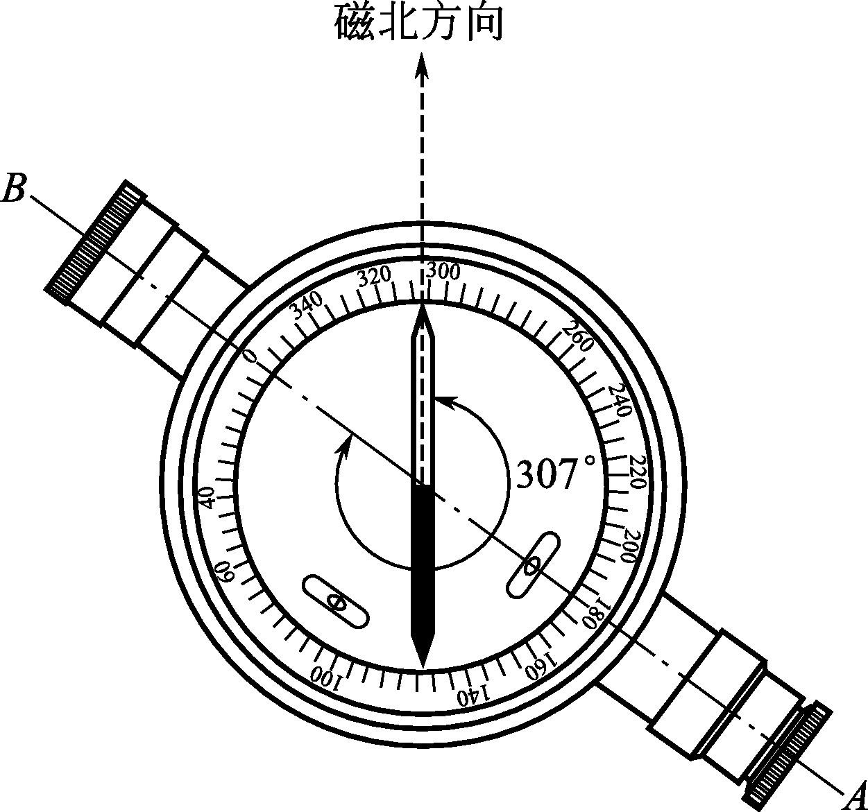 欲测直线 AB 的磁方位角,将罗盘仪安置在直线起点 A ,挂上垂球对中,松开球臼接头螺旋,用手前、后、左、右转动刻度盘,使水准器气泡居中,拧紧球臼接头螺旋,使仪器处于对中和整平状态。松开磁针固定螺旋,让它自由转动,然后转动罗盘,用望远镜照准 B 点标志,待磁针静止后,按磁针北端(一般为白色一端)所指的度盘分划值读数,即为 AB 边的磁方位角角值,如图4-17所示。使用时,要避开高压电线和避免铁质物体接近罗盘,在测量结束后,要旋紧固定螺旋将磁针固定。