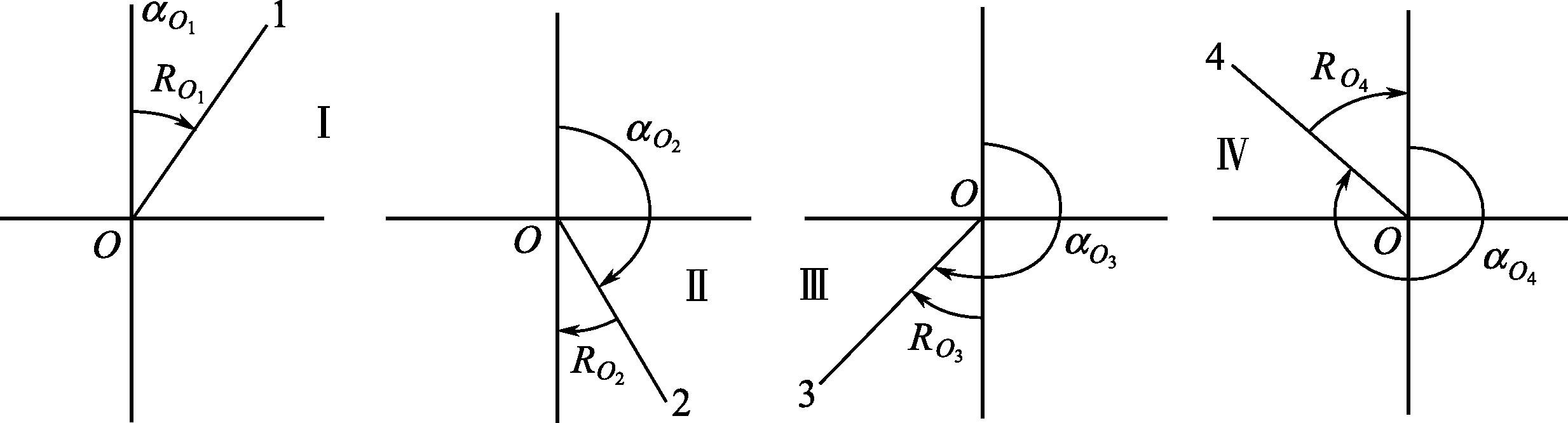 如图4-19所示。由坐标纵轴的北端或南端起,顺时针或逆时针至某直线间所夹的锐角,并注出象限名称,称为该直线的象限角,以