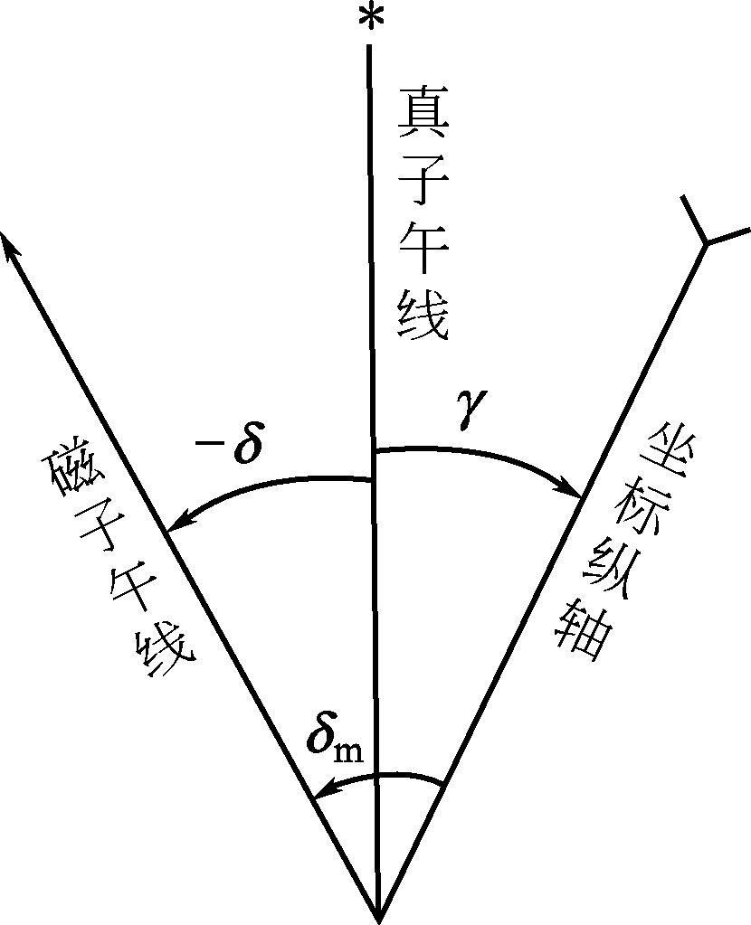 图4-14为三种标准方向间关系的一种情况, δ m 为磁针对坐标纵轴的偏角。