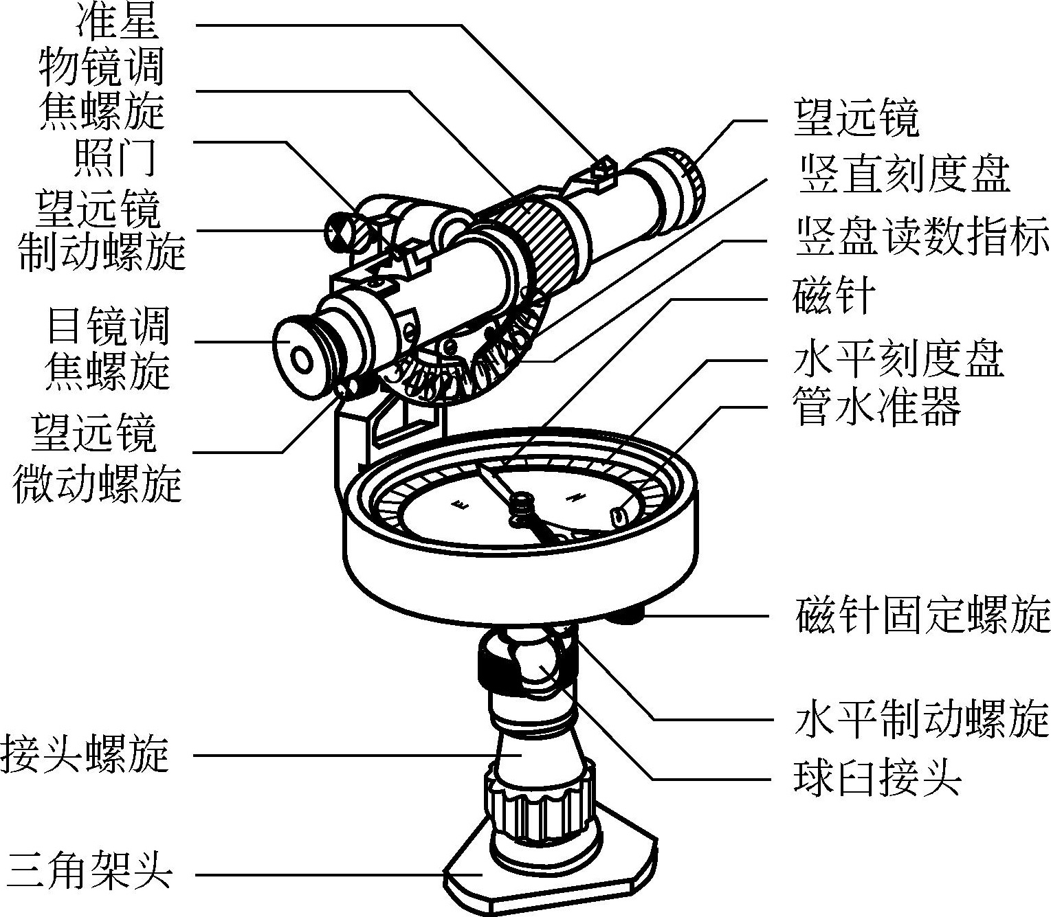 罗盘仪的主要部件有磁针、刻度盘、望远镜和基座,如图4-16所示。