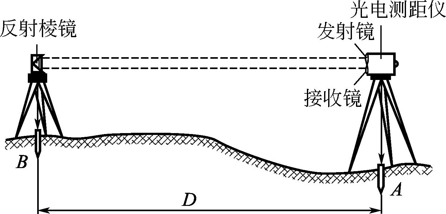 如图5-5所示。脉冲式光电测距仪是通过直接测定光脉冲在待测距离两点间往返传播的时间 t ,来测定测站至目标的距离 D 。用测距仪测定两点间的距离 D ,在 A 点安置光电测距仪,在 B 点安置反射棱镜。由测距仪发射的光脉冲,经过距离 D 到达反射棱镜,再反射回仪器接收系统,所需时间为 t ,则距离 D 即可按下式求得。