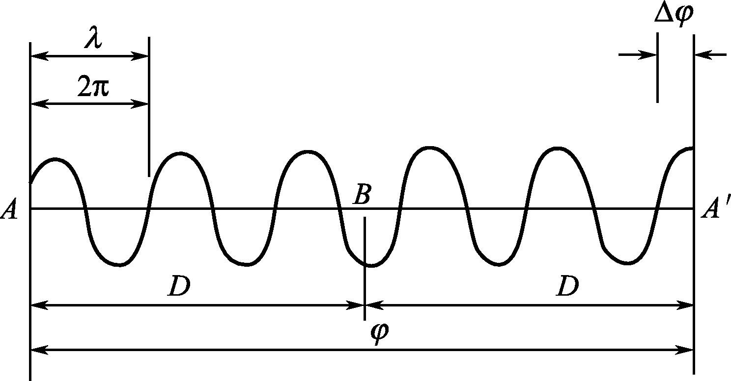 调制光波在待测距离上往返传播,其光强变化一个整周期的相位差为2π,将仪器从 A 点发出的光波在测距方向上展开,如图5-6所示,显然,返回 A 点时的相位比发射时延迟了 φ 角,其中包含了 N 个整周(2π N )和不足一个整周的尾数Δ φ ,即