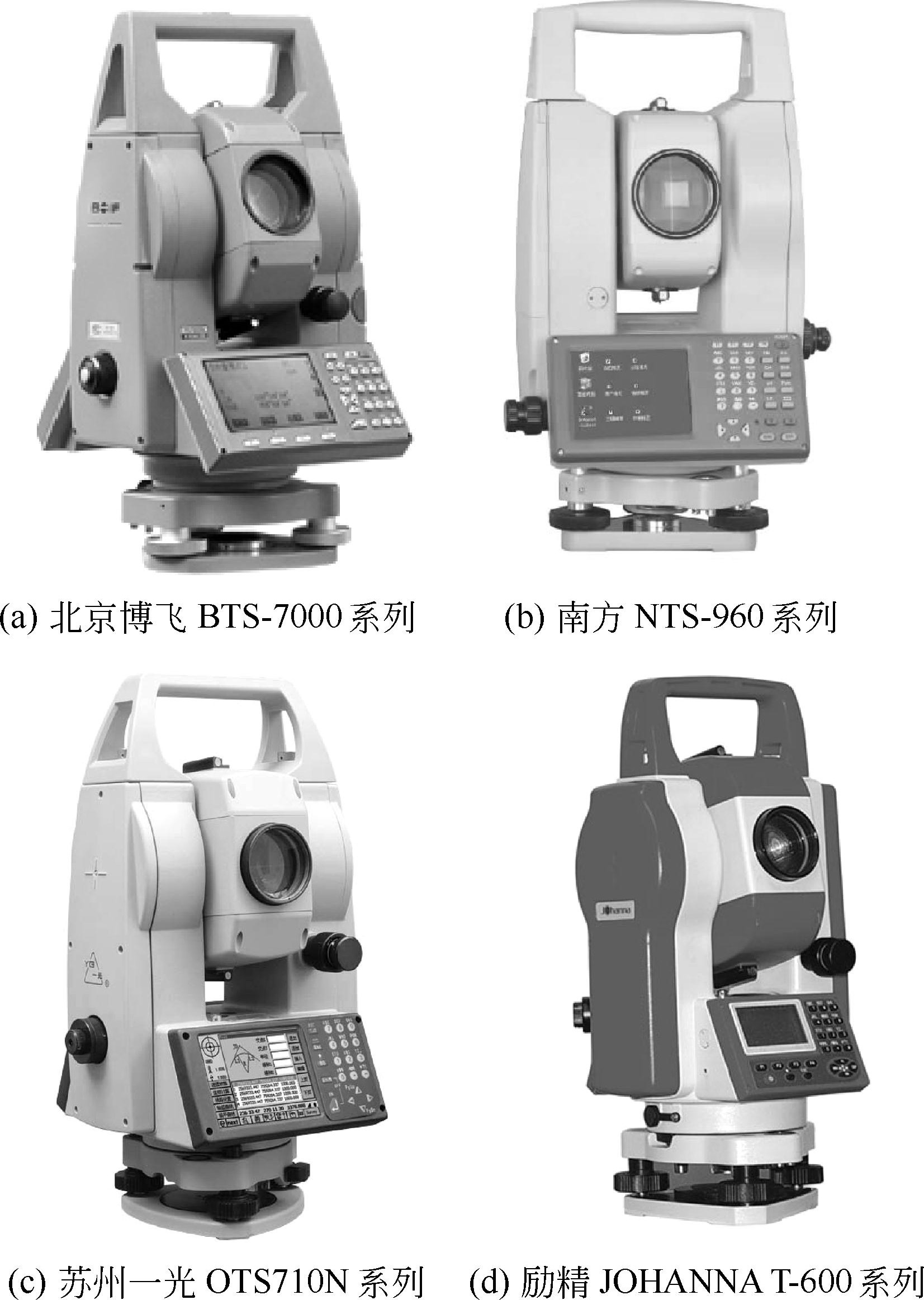 国内生产全站仪的主要厂家有苏州一光仪器有限公司、北京博飞仪器股份有限公司、常州大地测绘科技有限公司、广州南方测绘仪器有限公司、上海中翰仪器有限公司、上海励精科技有限公司、广州三鼎光电仪器有限公司等。部分国产品牌全站仪见图5-8。