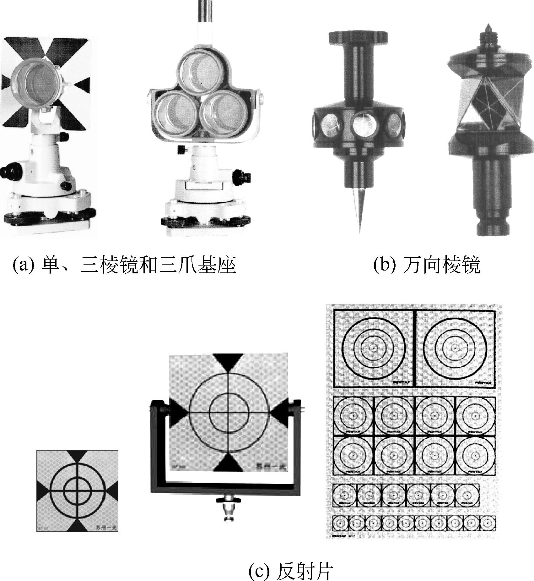 (2)全反射棱镜和反射片 用于测量时立于测点,供望远镜照准,其形式如图5-10所示。在工程测量中,往往根据测程的不同,可选用单棱镜、三棱镜、万向棱镜和反射片等。