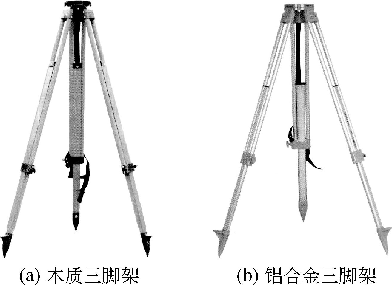 (1)三脚架 用于在测站上架设仪器,其操作使用方法与经纬仪相同(图5-9)。