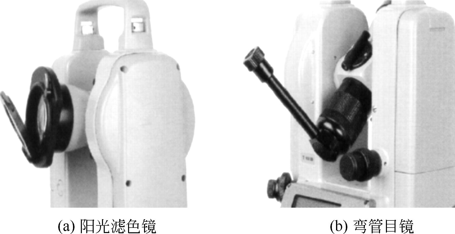 (8)阳光滤色镜和弯管目镜 阳光滤色镜[图5-12(a)]安装在望远镜的物镜上,对着太阳进行观测时,可以避免阳光造成对观测者视力的伤害和仪器的损坏;弯管目镜[图5-12(b)]是观测高度目标的垂直角太大时,为了观看目标方便而做的一种配件。