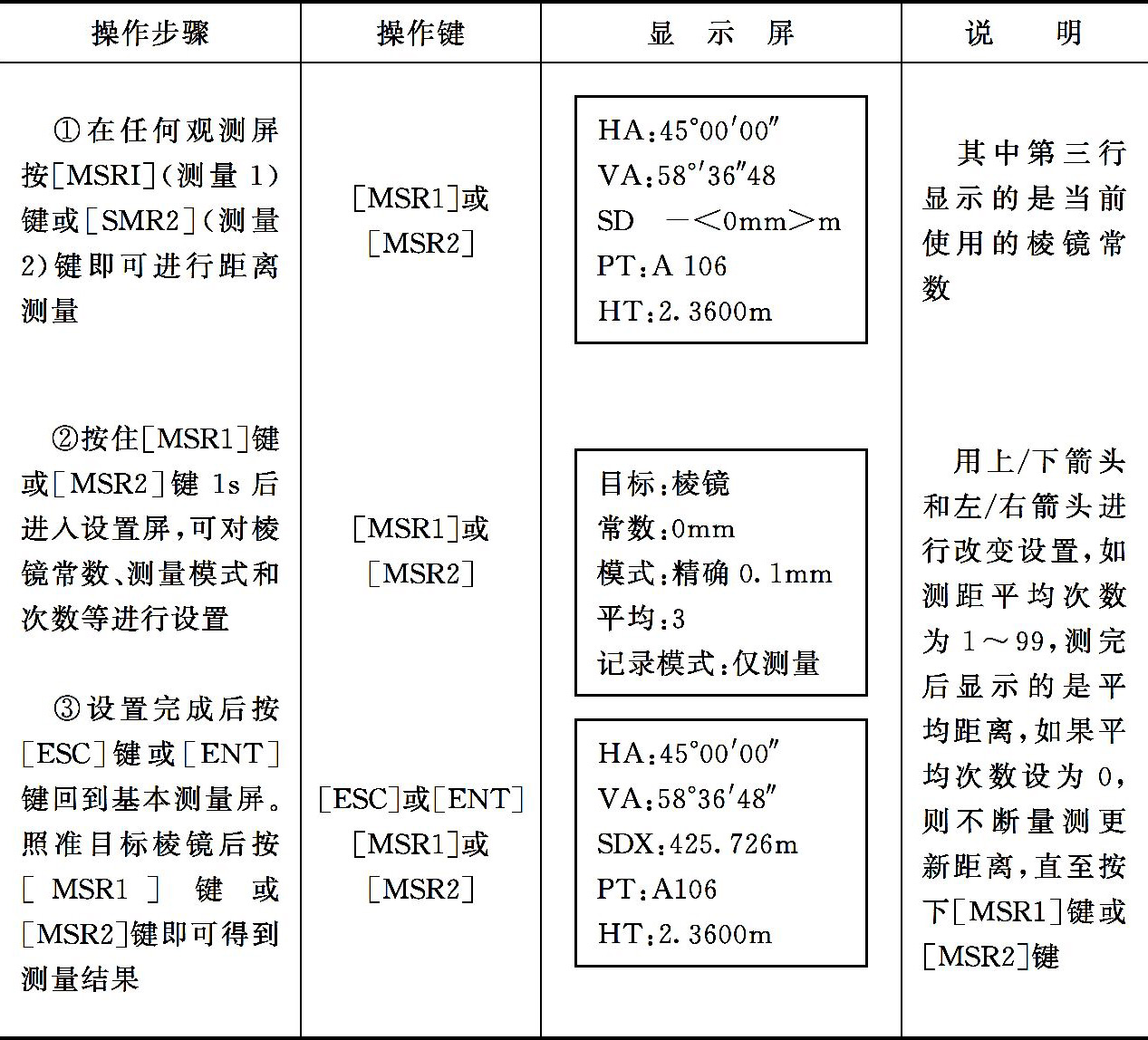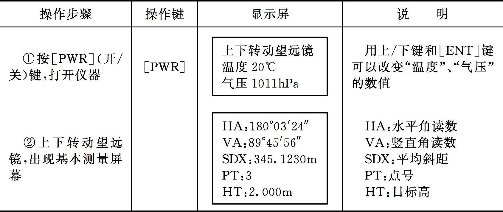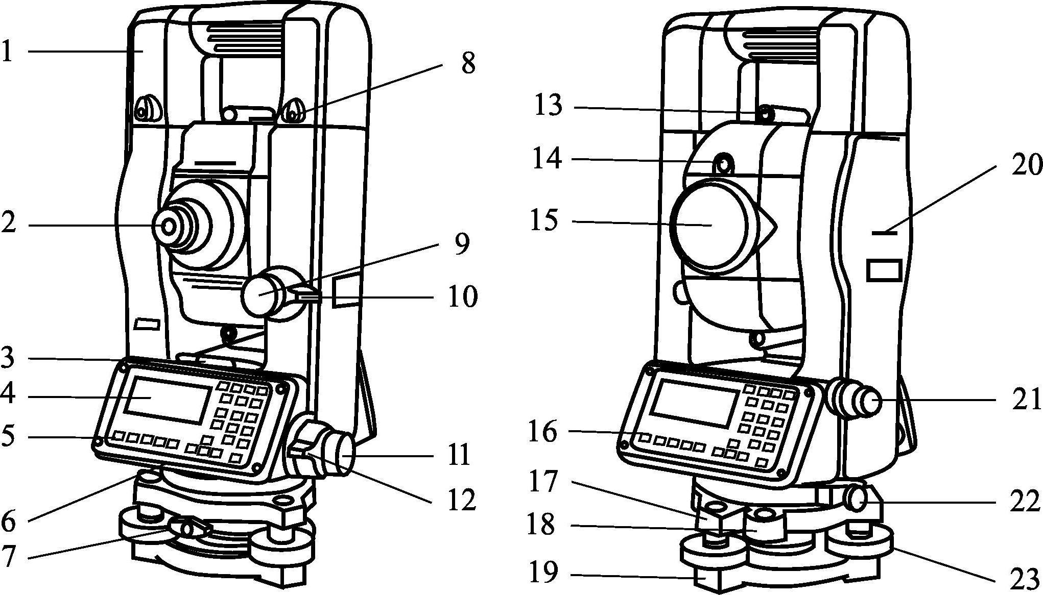 (1)测前的准备工作 首先安装电力充足的配套电池,也可使用外部电源。对中、整平工作与普通经纬仪操作方法相同,如要测距离等则需在目标处设置反光棱镜。