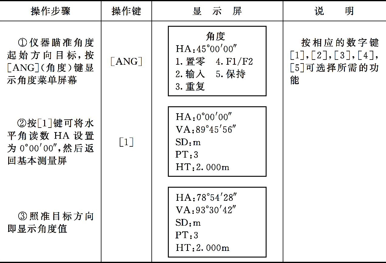 若要将起始目标的读数设置一个0度以外的度数可接[2]键输入;选择[3]键可重复测同一角度取平均值;选择[4]键可进行盘左、盘右测量。