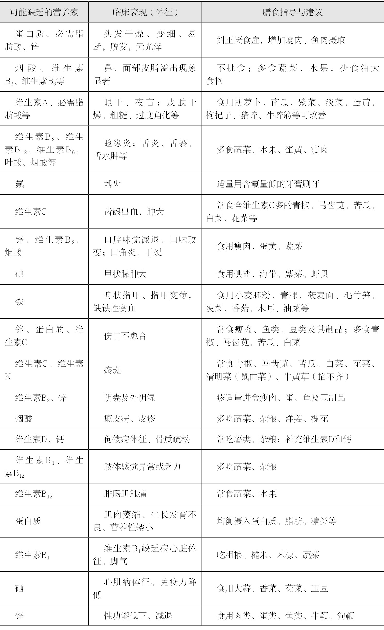 表3 机体缺乏某些营养素的临床表现及膳食指导