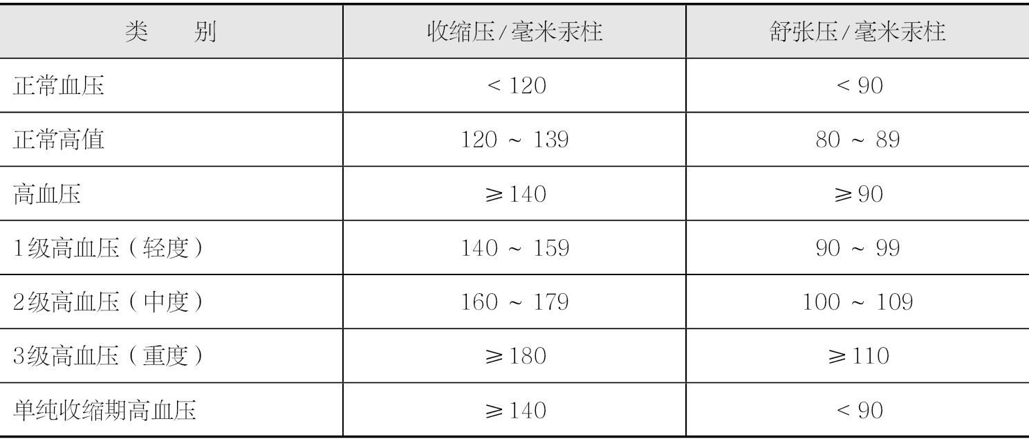 正常人的血压随内外环境变化在一定的范围内波动。血压水平随年龄逐渐升高,以收缩压较为显著。但50岁以后舒张压呈现下降趋势,脉压也随之加大。个体之间血压有较大的差别。在一定范围内,血压(包括收缩压或舒张压)值与心血管疾病的发生率呈密切相关性。根据基层版2009年《中国高血压防治指南》(简称基层版),高血压、血压水平的定义和分类见表1。
