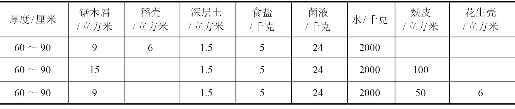 尽量用锯末,锯末不易得到可部分用稻壳、秸秆等替代,表面二三十厘米仍用锯末。应注意稻壳要破碎,秸秆应切短(0.5米以下)或粉碎,但不宜太细。