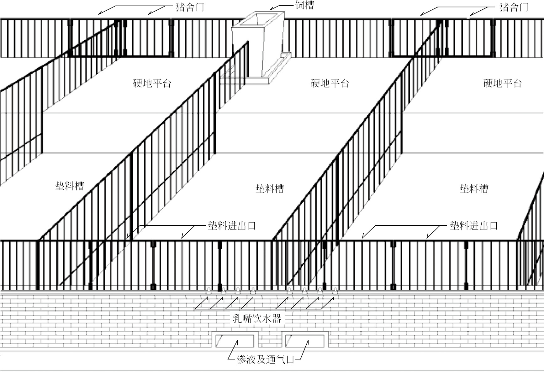地上槽模式(图2-44~图2-46)就是将垫料槽建在地面上,垫料槽底部与猪舍外地面持平或略高,硬地平台及操作通道须垫高50~100厘米,保育猪50厘米左右,育成猪100厘米左右,利用硬地平台的一侧及猪舍外墙构成一个与猪舍等长的长槽,并视养殖需要中间由铁栅栏分隔成若干圈栏,以防止串栏。