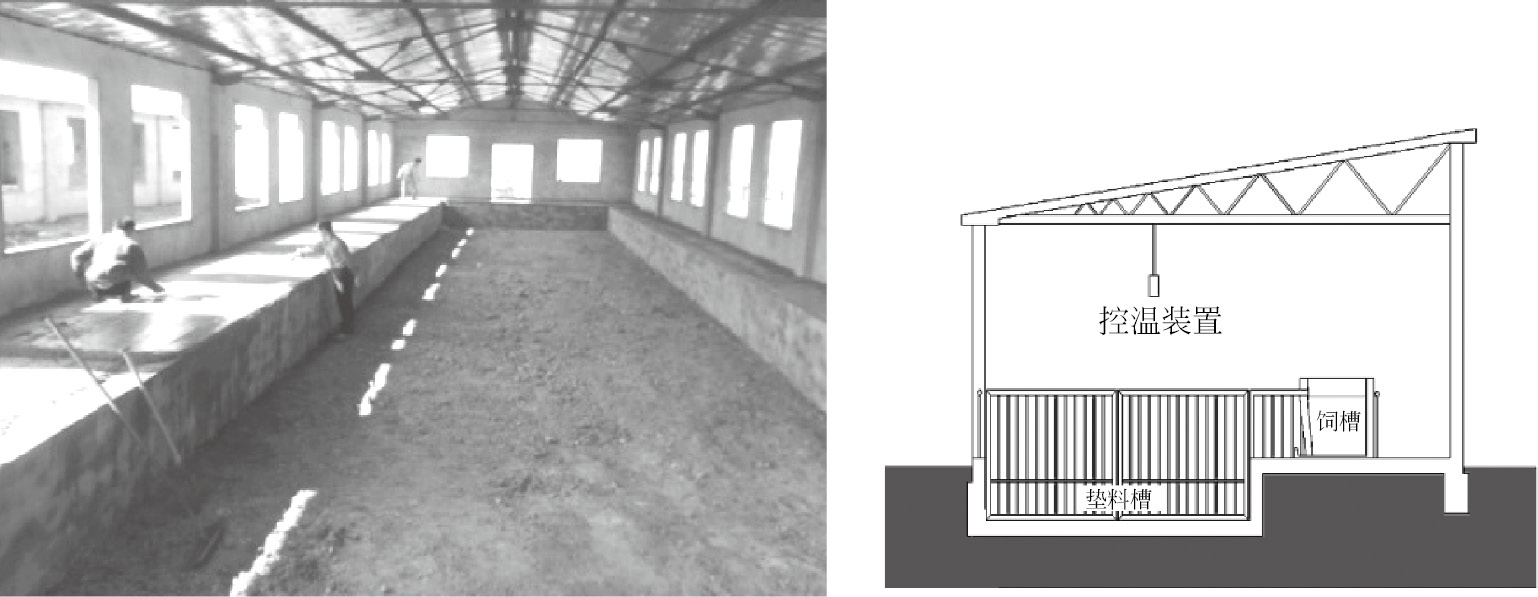 发酵床猪舍的建设要求既符合猪只的生长需要,又要为微生物的发酵提供有益的环境。一般对发酵床猪舍的建设要求是坐北朝南,为了保证舍内采光效果好,应在圈舍内南面屋顶中部建有天窗,南北墙底部设有通风口可使圈舍内形成空气对流,从而使圈舍通风良好、空气新鲜。圈舍内食槽和自动饮水装置可建在南北两侧,这样猪只的来回跑动不仅使垫料得到充分混合,又减少猪的皮下脂肪含量,提高肉品质。在饮水槽下面需设置承水槽,以便将漏的饮水引流到舍外,防止垫料的湿度过大。