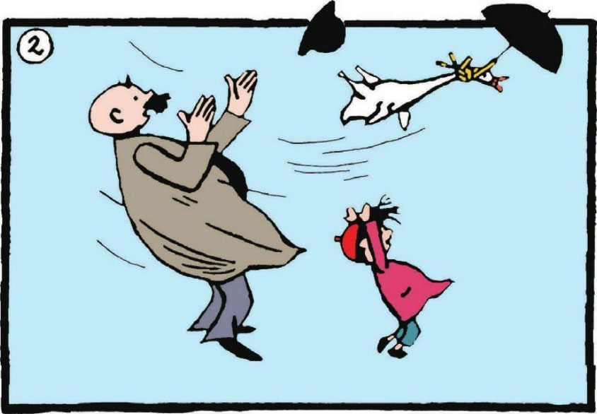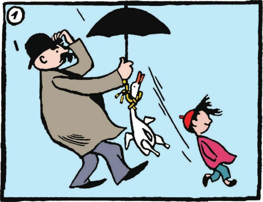 "Seize it! Chase it!"A gust blows away the mallard, the umbrella and the hat.