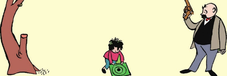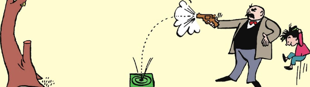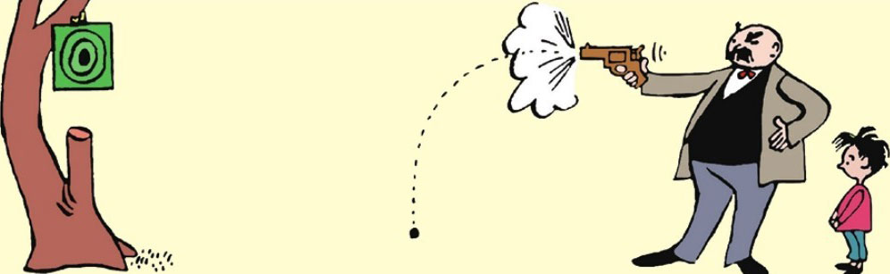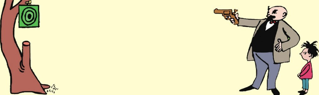 This time Father really hits the center, so son shouts happily, "Wow! Sure! Really great Dad!"